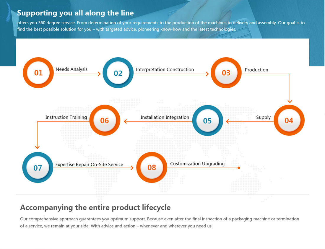 我們全面的方法保證您獲得更好的售后支持 因為即使在最終檢查包裝機或終止服務(wù)之后,我們仍然在您身邊。 通過(guò)建議和行動(dòng) - 無(wú)論何時(shí)何地,只要您需要我們。